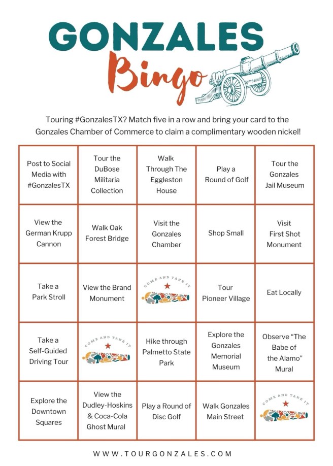 You can also visit Gonzales and complete this Gonzales Bingo and bring your completed card to the Chamber of Commerce for a prize!